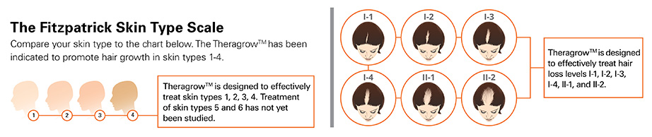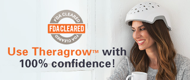 Theragrow® is an FDA-cleared medical device intended to only treat women ages 18 to 65 years of age for androgenetic alopecia by promoting hair growth in females with female pattern hair loss (FPHL) on the Ludwig and Savin Hair Loss Scale I-II, Fitzpatrick Skin-Types I to IV. Please read all instructions in the safety manual enclosed with the product before use. Please be sure to follow all warning and safety information. Please save the instructions for future reference. You should consult a health care professional if you have any questions about whether use of Theragrow® is appropriate for you.